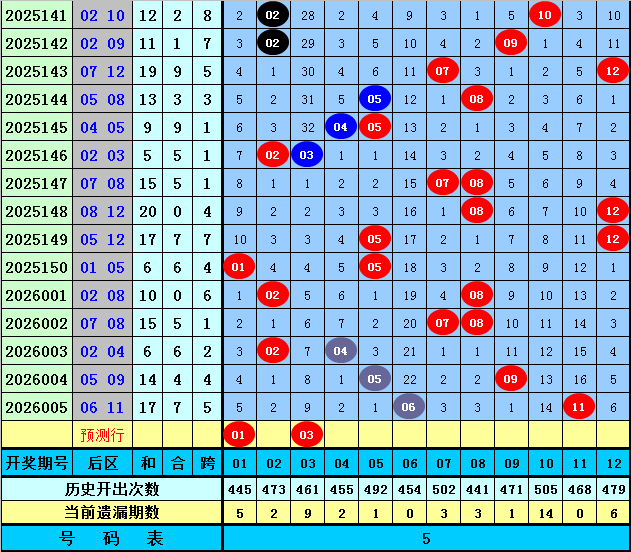 后区分析:上期后区开出奖号06和11,在最近50期开奖中,后区奖号012路落号比为25:31:44,前10期后区012路落号比为5:4:11,本期后区关注号码01、02、03、05、06,两码参考01、03。